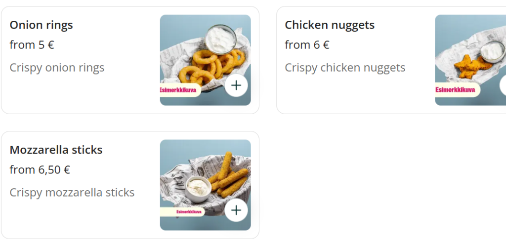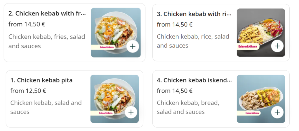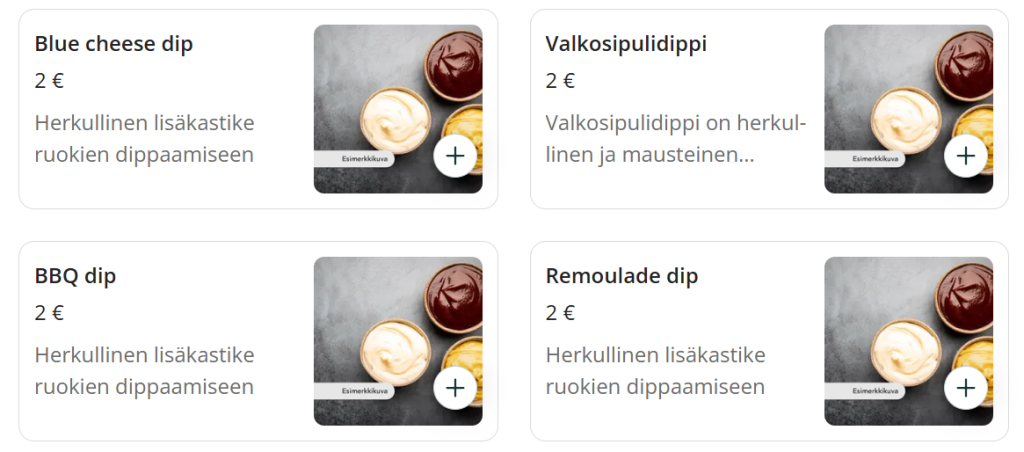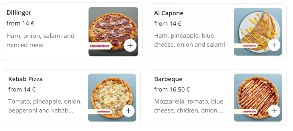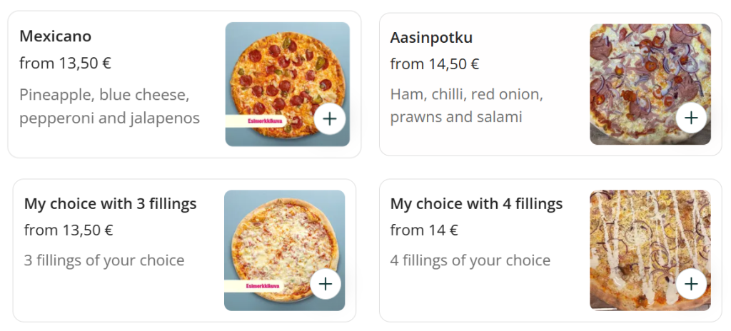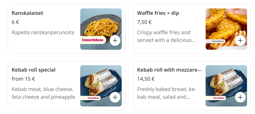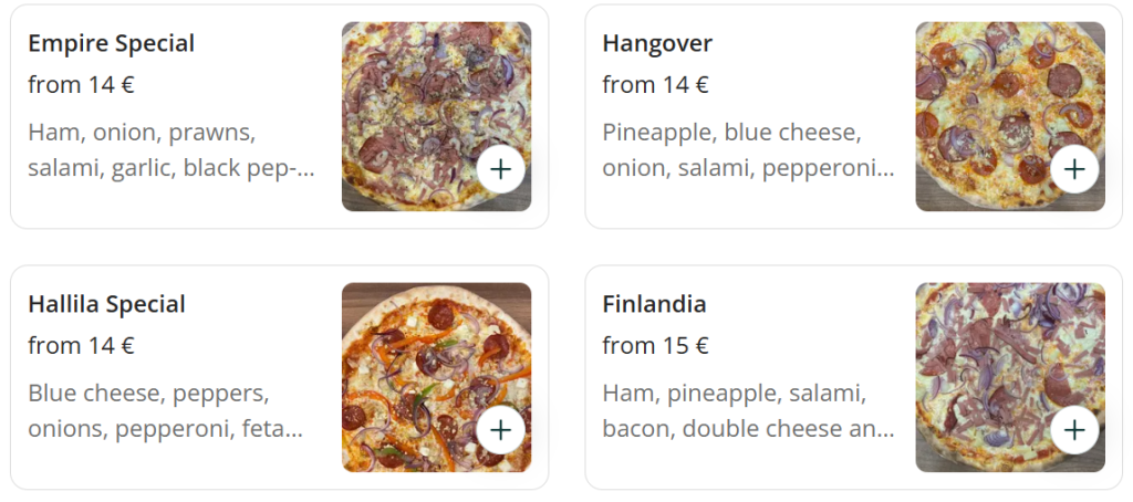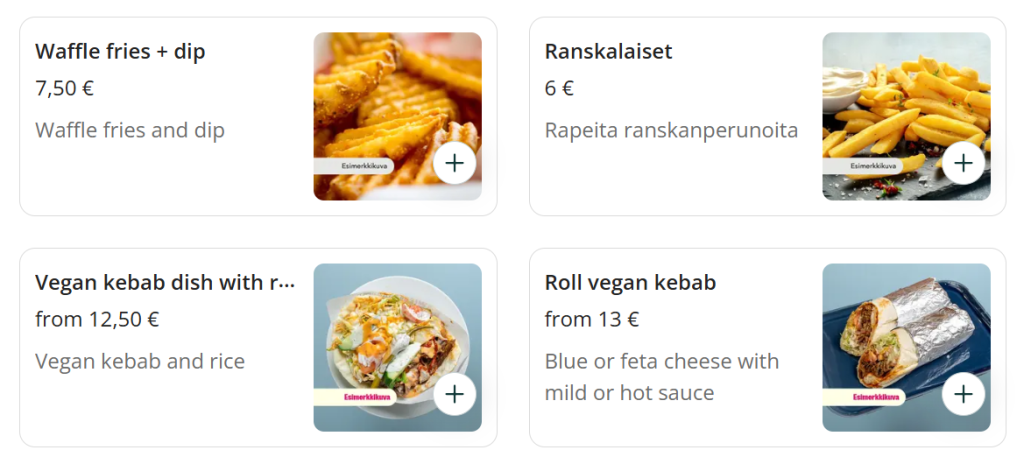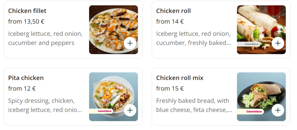 BBQ (8) Beef (131) Biryani (5) blog (1) Burger (118) Cakes (2) Cheese (27) Chicken (185) Coffee (11) Desserts (57) Dips (12) drinks (28) Duck (5) Döner (3) Falafel (27) Fish (35) Fries (17) halloumi (1) Ice Cream (5) Italian (84) juomat (1) Kebab (50) Lounas (184) mushrooms (1) Noodles (13) Pasta (6) Pizza (99) Pizzeria (81) Pork (21) Ravintola (184) Rice (22) Roll (25) rolls (2) Salads (115) Seafood (14) Soup (8) Steak (8) Sushi (8) Tacos (3) Vegan (164) Vöner (10) Wines (12) Wings (26)