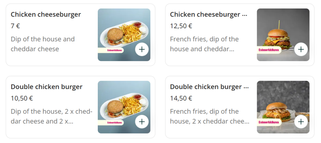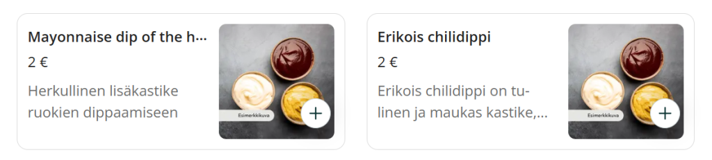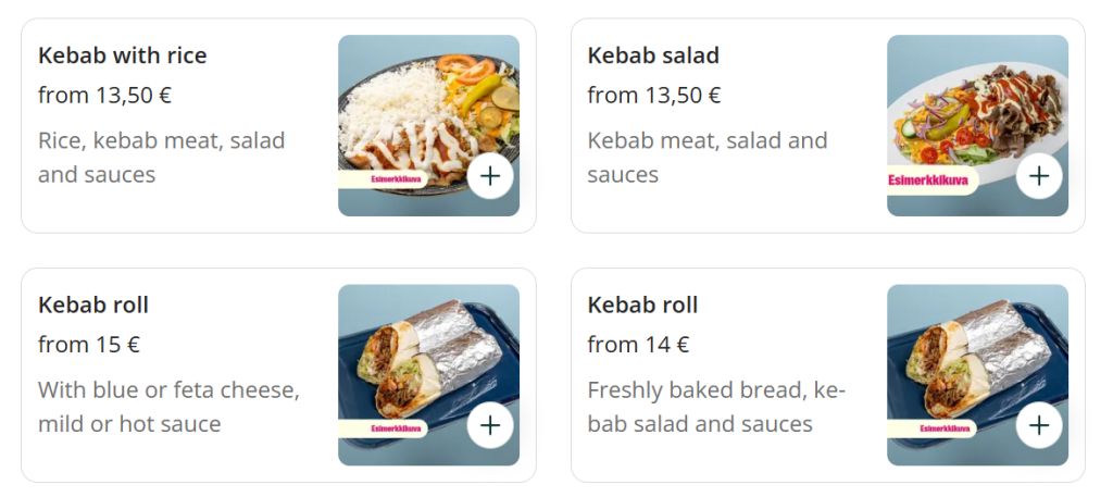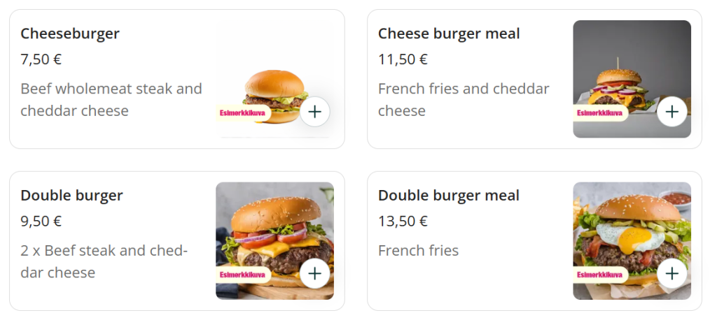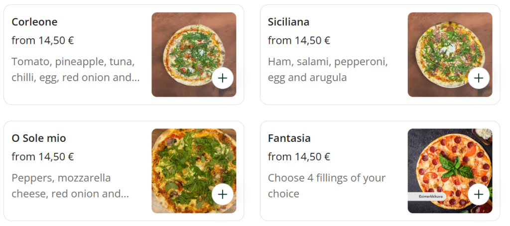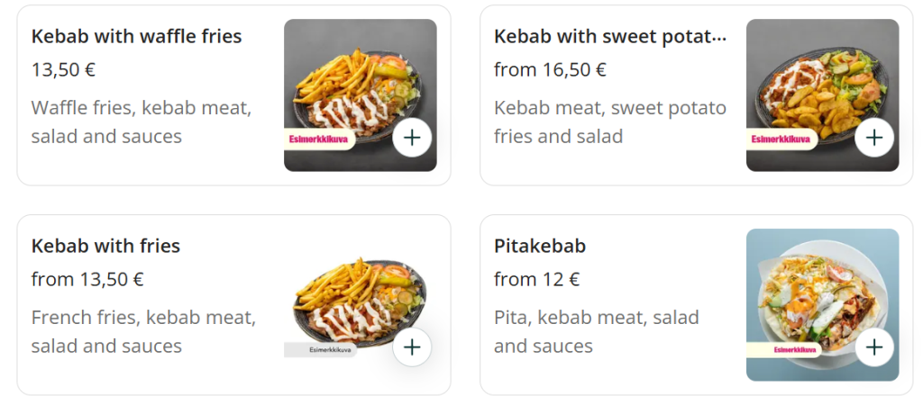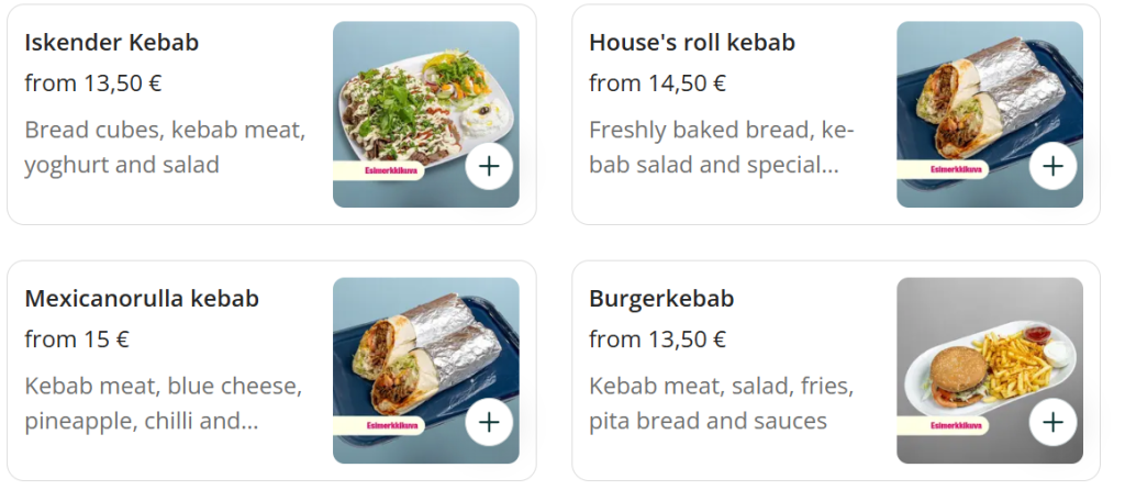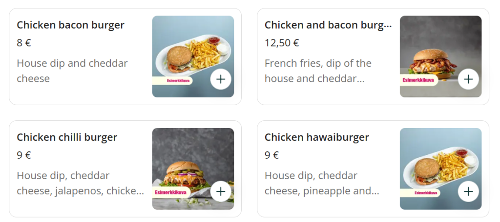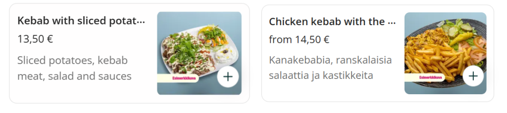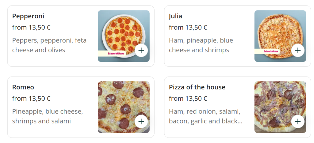 BBQ (8) Beef (131) Biryani (5) blog (1) Burger (118) Cakes (2) Cheese (27) Chicken (185) Coffee (11) Desserts (57) Dips (12) drinks (28) Duck (5) Döner (3) Falafel (27) Fish (35) Fries (17) halloumi (1) Ice Cream (5) Italian (84) juomat (1) Kebab (50) Lounas (184) mushrooms (1) Noodles (13) Pasta (6) Pizza (99) Pizzeria (81) Pork (21) Ravintola (184) Rice (22) Roll (25) rolls (2) Salads (115) Seafood (14) Soup (8) Steak (8) Sushi (8) Tacos (3) Vegan (164) Vöner (10) Wines (12) Wings (26)